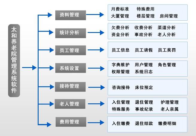 太和养老院管理系统软件,集接待和入住管理、收费管理、生活照料及护理服务管理、老人档案管理、人事管理、考勤管理、工资管理、财务管理、办公自动化、统计分析等管理组件为一体。